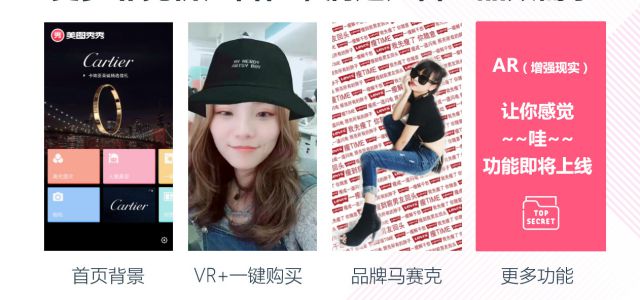 1.AR定制 AR:即增强现实,也被称之为混合现实,在屏幕上把虚拟世界套在现实世界并进行互动。 那么,在调性相符的海量用户和强大的产品矩阵必不可少的同时,如何成功引爆粉丝营销,最关键的可能还是你的玩法是否具有新意,美图AR特效定制广告恰好满足了这一点。将眨眼、张嘴、亲吻等头部动作和简单的手部动作与相应的背景音乐结合,形成有趣生动的用户作品图片/视频效果展示,让用户在现实世界中真实地感受到虚拟空间中模拟的事物,增强使用的趣味性和互动性,从而促成图片/视频PUGC的分享与传播。