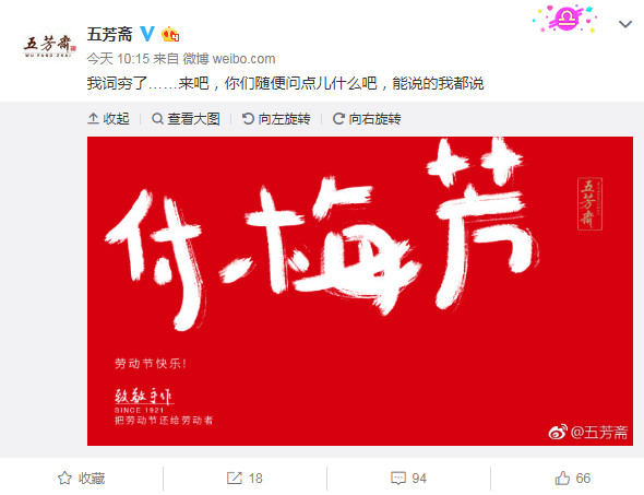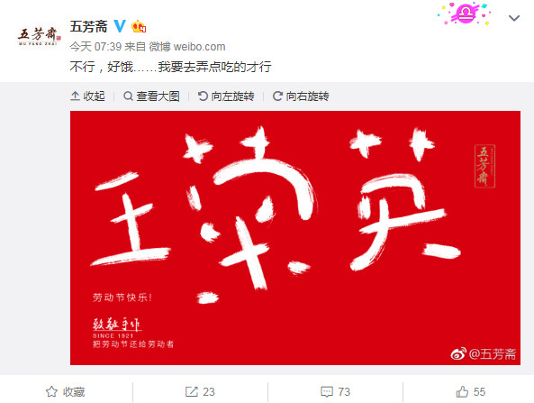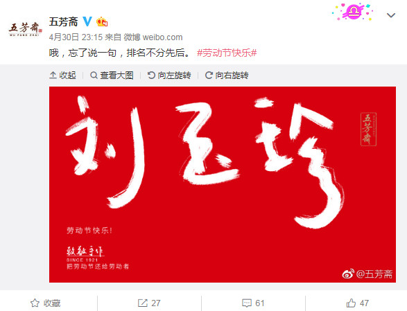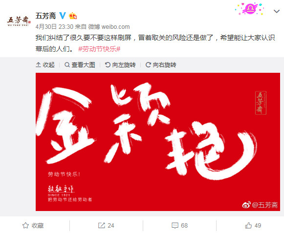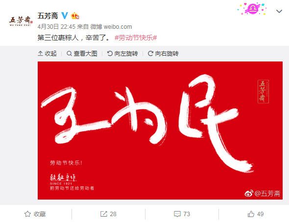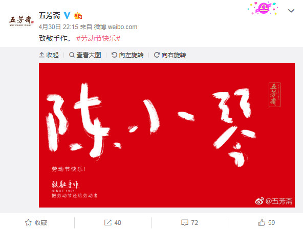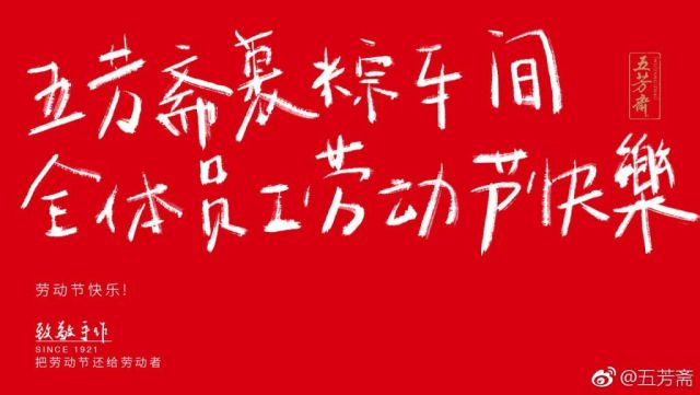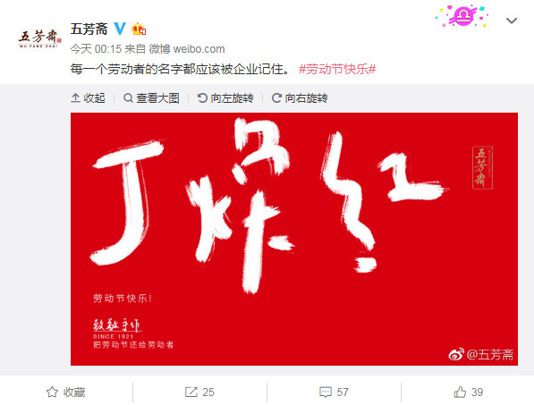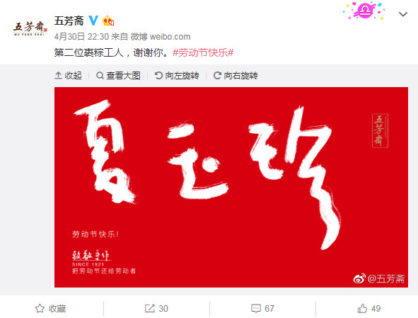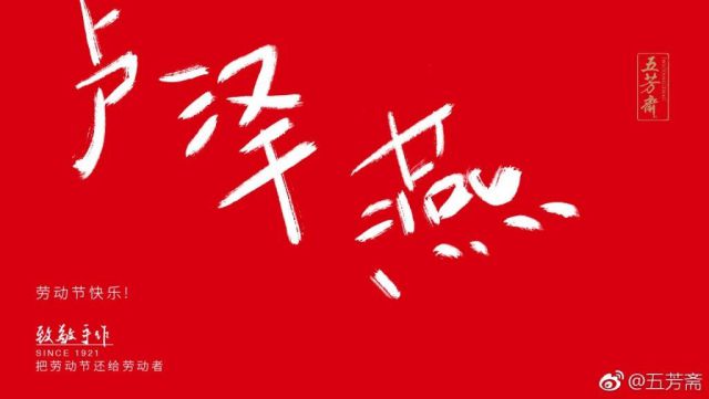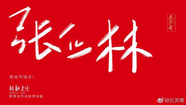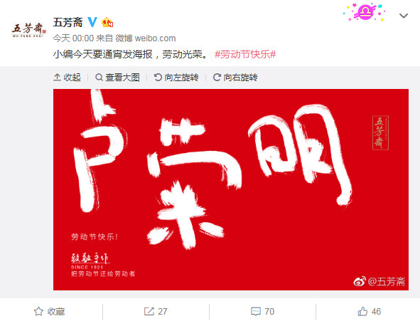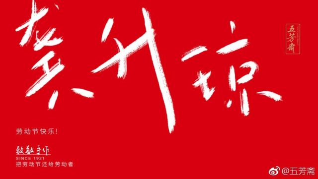 这些红色海报里的人物名字,他们都是来自五芳斋裹粽车间里的裹粽工。选择这样干的初衷,是五芳斋认为:劳动节,就应该还给劳动者。五芳斋也想借此机会,用手动发微博的方式,致敬那些在一线的手作劳动者。