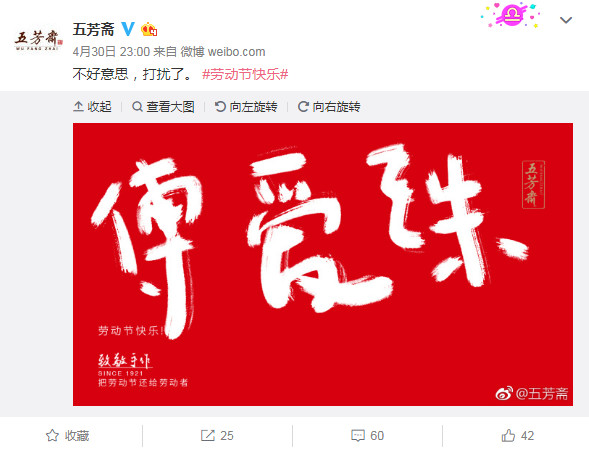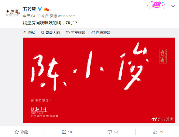 基本上你去看一圈的话,能感受到背后发微博的那位心路历程的变化。所以劳动节,五芳斋的微博运营,才是真的有在劳动! 和五芳斋一样,淘宝也是退回到原点,把目光放到了“自家人”身精准营销哪家强上。这些人有个统一的名字,叫“淘宝掌柜”。淘宝很壕气地在上海、杭州、广州,承包了3座户外广告大屏,“祝淘宝掌柜们五一快乐”。