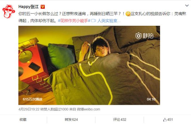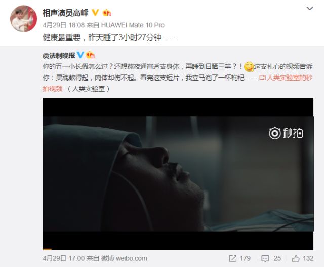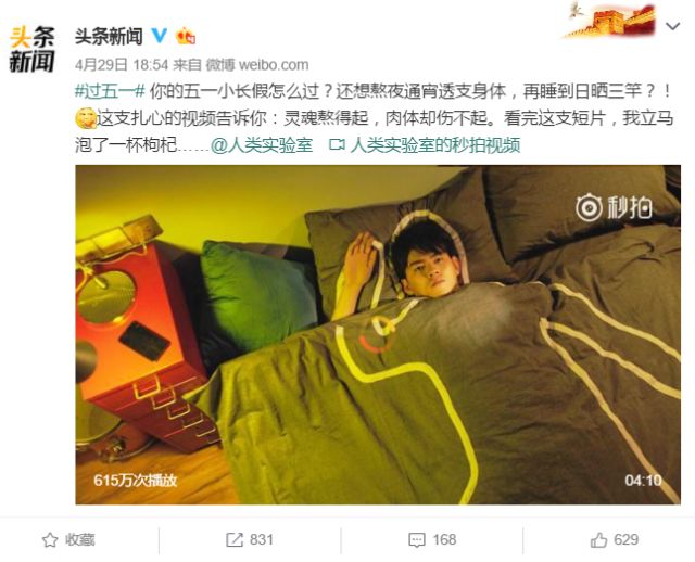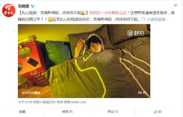 成为五一热点被各大媒体号翻牌 2、关怀社会的价值传递,撬动目标群体引优质互动 这支《健康本该如此》的短片由999出品,通过“扎心”的文案和数据引发观众的情感共鸣,映射出当下都市人的忙碌、亚健康状态。我们被这条短片扎心,是因为里面有每一个都市人的影子:我们加班、熬夜、感受着日渐疲倦的身体做出着亡羊补牢的措施,并在转发时留下的感怀,是因为片子里的主人公,就是我们自己。 这并不是999第一次尝试情感营销了,从17年刷屏全网的感恩节短片《有人偷偷爱着你》到定制网剧《谢谢你陌生人》再到《健康本该如此》。999巧妙的摆脱了广告片惯有的产品卖点教育,而是将价值观和企业愿景植入到观众的心中——反观社会,将人文关怀带到自己的短片中,开启全民健康关爱行动成为健康事业践行者,树立起品牌在消费者眼中最暖心的企业形象。 随短片一同发布的还有一个测试熬夜指数的H5,俏皮有趣的标签和轻松愉快的测试节奏,成功抓住了用户的好奇心,在朋友圈引发了一次晒熬夜指数的比拼。