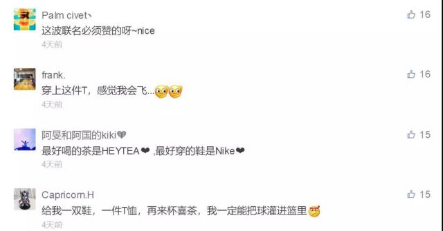 这款联名杯套就是喜茶在2017-18耐克高中篮球联赛巅峰赛(4月29日-30日)期间,和耐克北京联合推出的。不仅如此,双方共同推出了球迷专享活动,消费者只要穿着“耐克热血助威TEE”,前往喜茶北京三里屯店消费,即可获赠喜茶赠饮券。 喜茶和耐克的这波跨界虽然声势不大,但十分有趣,而且精准触达到了目标人群,在年轻消费者中圈了一波好感。