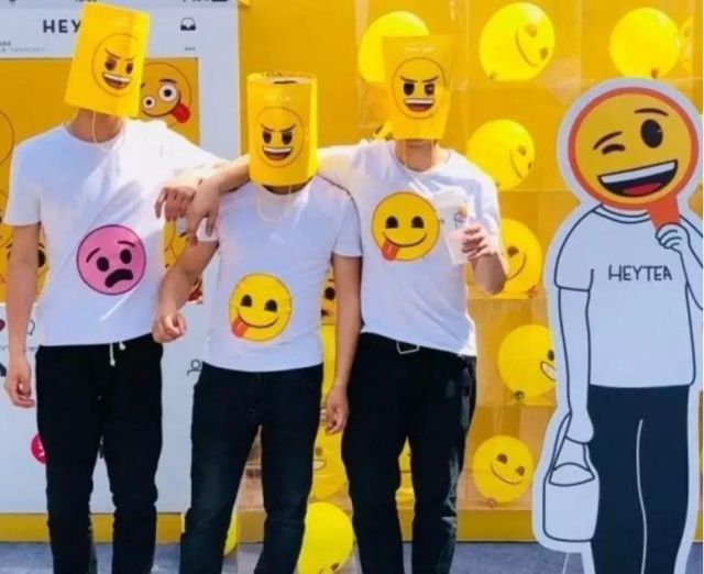 其实,在此之前没多久,喜茶刚和Emoji以及美图秀秀进行了一场全方位的跨界。从3月31日到4月6日,喜茶门店的杯套、纸袋、会员卡等都变成了“表情包”,为了配合愚人节的节日氛围,喜茶还发起了“套头挑战”。