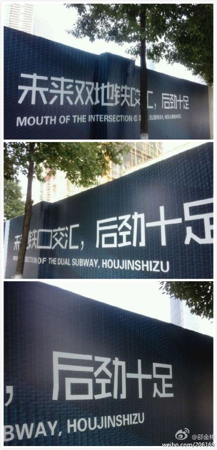 这则广告的营销点就显得非常低俗,而且有一种“玩弄”女性的意思,像这样的广告文案只会引起用户的反感心理,降低品牌信誉。 3、没文化,很可怕 对于广告文案设计,有些广告主总想表达的高大上一点,因此就出现了下面这样的广告文案: “未来双地铁口交汇,后劲十足 MOUTH OF THE INTERSECTION OF THE DUAL SUBWAY,HOUJINSHIZ!”