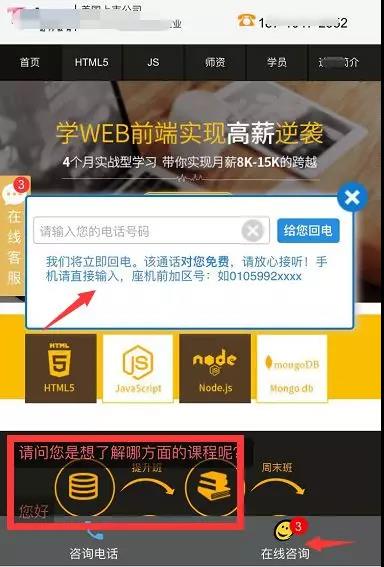 所以,信息流在创意撰写上,会以“产品优势”为中心,以用户需求为基调,向外延伸展开。 03、着陆页 竞价的主要用户群体为“意向人群”。即对产品已经产生需求的用户。所以,在着陆页的制作上会更倾向于转化,较为简单粗暴,目的就是让用户点击鄂州网站的建设链接,获取线索,形成转化。通常在着陆页上的制作套路为: a.各种弹窗引导对话 b.免费活动诱导线索 c.多转化通道诱导咨询 比如下图,我们可看到在着陆页上,满屏都是转化点:诱导咨询、诱导填写线索等等,以此来最大限度形成转化。