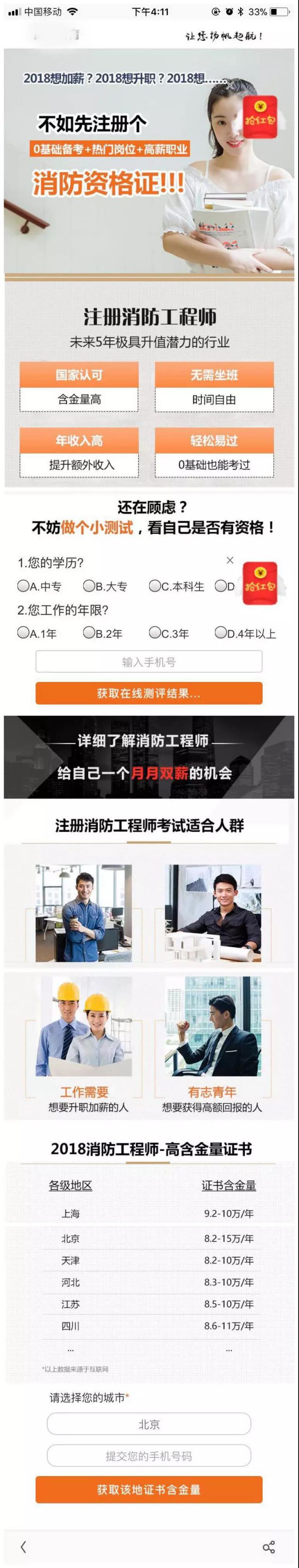 于信息流而言,主要目前群体为“潜在用户”。即对产品没有强烈需求的用户。所以,在制作着陆页上,会更加注重用户心理的把控,用页面过渡来激发兴趣,再进行引导线索转化,而不是太过直接的转化点设置。通常在着陆页上的制作套路为: a.迎合创意需求 b.戳中用户痛点 c.利用营销套路获取线索 比如下图。先和创意相呼应,通篇介绍考取消防证的好处,来获取用户的信任,并利用用户的好奇心理获取线索。 与竞价相比,信息流并没有过多的转化点,更多的是满足用户需求的一个过程。