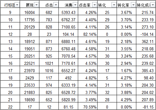 PC时段转化成本 上述是对YD端和PC端时段转化分析。由图可看出: 1. YD端在13点、17点时成本较高,19点-21点时转化成本较低 2. PC端在10点-11点、14点-17点时转化好且成本低,但13点和19点转化成本较高。 基于此,做了如下优化操作: a.PC端 1. 采用时段溢价工具来控制时段的消费降低13点和19这两个时段消费,增加10点-11点、14点-17点的溢价 2. 增加其他时段的流量添加有转化关键词的同义词、提高有转化关键词的价格,导出搜索词报告添加账户里面没有的搜索词 b.YD端 1. 降低移动端的13点,17点的出价降价10% 2. 增加19点-21点的流量提升该时段的出价15% 02、优化关键词 单元词转化分析
