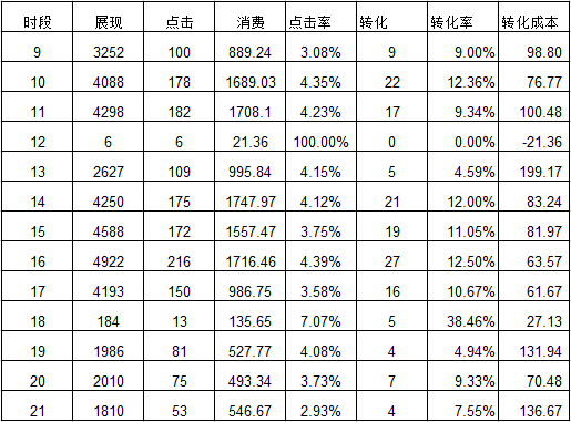 4月营销数据汇总 通过对数据进行对比,我们可发现上述数据存在以下问题: 1. 消费下降29% 2. 有效对话下降17% 3. 线索数量下降8.4% 4. 线索成本下降97.网站加速cdn24元/个 其实,可看出上述问题大都是由于流量少、质量低所引起。所以,在5月份我们可将计划定为:开拓有效流量。 优化方案 01、增长时段