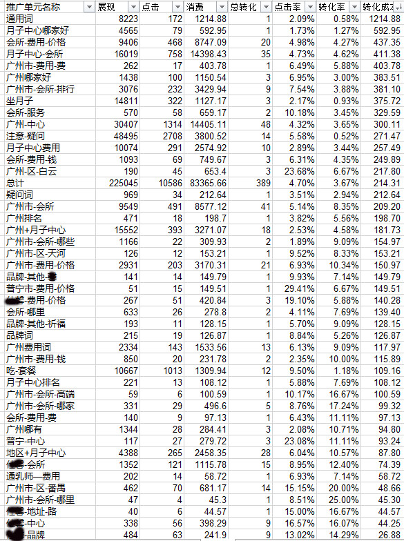 部分单元转化成本截图 从上图中,可看出: 1. 数据赋能营销通用词和费用词单元转化成本过高 2. 地区+月子中心类词和品牌词转化成本低 3. 竞品词计划中:品牌-其他-妈咪没有转化 基于此,做了如下优化操作: 1. 暂停品牌-其他-妈咪的单元投放 2. 拓广州地区+月子中心类词的地域词流量,同时提高地区+月子中心类词的出价上调5% a.关键词分析