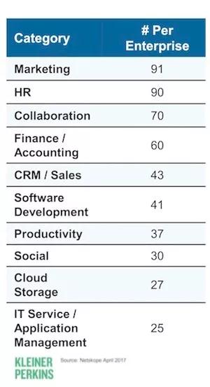 除了允许不同的应用程序和企业交叉连接之外,基于云的API的优势还体现在改变了核心应用程序本身的设计和构建方式。它们越来越多地被构建为一系列微服务(microservices),这些微服务在内部营销信息系统使用API来将数十个或数百个小且灵活的零件来组成大型解决方案。 这种微服务方法的主要优点如下: 1.个体微服务可以更快地发展。 2.大型解决方案可以更轻松地添加和删除微服务组件。 3.这些微服务可能会作为独立产品展示给其他人,以便他们在内部或外部(例如,API经济体中的接触点)进行利用。 这些都是在整个组织大量采用各种规模的基于云的应用时所发生的。 正如今年早些时候Mary Meeker的《互联网状况报告》所报道的那样,企业平均会使用1,000种云服务,其中企业营销部门平均使用91种云服务,人力资源使用90种,财务和会计使用60种,销售使用43种,等等。