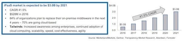 这是iPaaS解决方案(Zapier,Workato,PieSync,Azuqua,IFTTT,Segment,Automate.io,Dell Boomi免费策略营销,Bedrock Data,Scribe,Built.io,Flowgear, Elastic.io,SnapLogic,MuleSoft,Tray.io等等)蓬勃发展的机遇: iPaaS通常通过这些暴露在外的“连接器”来处理与云服务和API相关的技术整合。非技术型的业务人员可以通过改变它们之间的连接从而达到创建自己的工作流和实现业务自动化的目的。 iPaaS使这些非技术型业务用户(如营销人员)成为了“公民”整合者。 AGC Partners今年早些时候发布的一份报告量化了整个“整合”的增长量,这其中iPaaS解决方案作为一小部分也被包含其中: