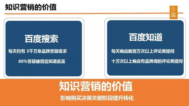当网民有需求的时候,会选择在百度的搜索端进行关键词的检索。比如我现在想找一家搬家公司,我会在百度搜索框当中搜索北京搬家公司,北京搬家公司哪家好?通过对展现出的商家创意再进行下一步的深入对比与了解。 如果我已经选择好了一家搬家公司,比如百度搬家公司,我还会选择在百度知道上搜索,看看其他网民对于百度搬家公司的一些评论和评价。回答的好肯定会对于我选择百度搬家公司起着非常重要的引导作用。 所以知识营销就是在百度知道这种原生平台的基础上,衍生出来的一款产品。他影响着购买决策,关键词阶段的最终转化。