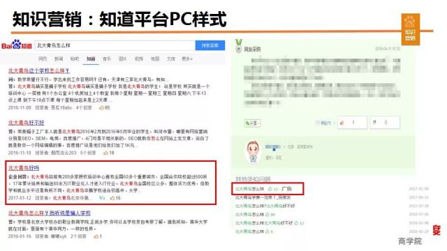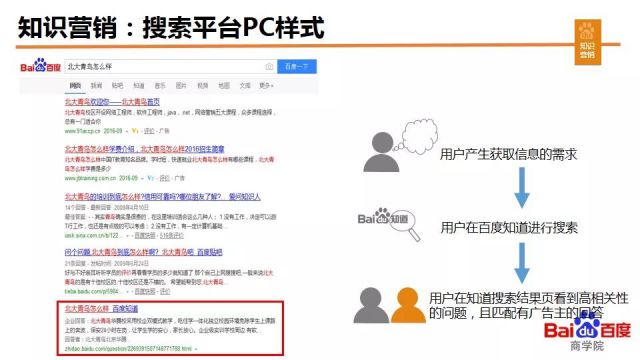 知识营销目前可展现在pc电脑端的搜索平台和百度知道平台上,也可展现在移动端的搜索平台和百度知道平台上,接下来我们具体分别来看一下。 我们先来看电脑端展现形式。可展现在百度搜索推广的搜索结果页面 原生类的展现 回答标注了企业回答 同时还有回答者的具体名称 给人更真实可信的感觉。在这里我们需要注意的是 标注推广的是搜索推广的结果 注意互联网营销推广销售区分