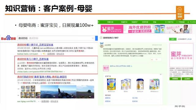 我们来一起看个案例,这是一家做母婴行业的 叫做蜜芽宝贝 日展现在100万以上 网民通过搜索澳洲奶粉 蜜芽宝贝以一种第三方的身份回答网民的问题,给出相应的答案,同时标注出自己是一家育儿的商家,这样可以增进网民的好感,有需求的网民可能就会主动去下载蜜芽宝贝的app,从而拉近与网民的距离,提升品牌的形象。