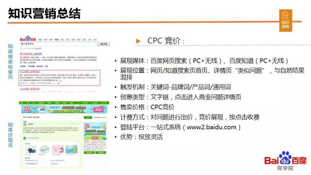 知识营销目前采取的是cpc,按点击付费的方式,那我们可以自助的控制我们的出价和预算,展现的频道是在我们前面已经说到的百度的网页搜索的pc端和移动端,百度知道的pc端和移动端。 排名位置是在网页和知道页的首页,还有知道详情页的类似问题以及自然结果的排名结果。 我们可以通过提交品牌词,产品词,通用词,都可以触发知识营销的创意内容。 创意是通过文字链的形式,点击进入,进入到我们的商品专属页面。