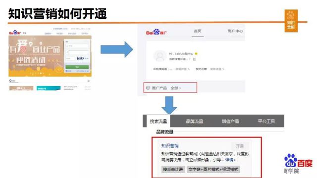 如何开通这款产品呢,只需要我们登录到后台,找到推广产品,点击全部,就会进入到目前百度可开通的商业产品界面当中,选择知识营销开通即可。