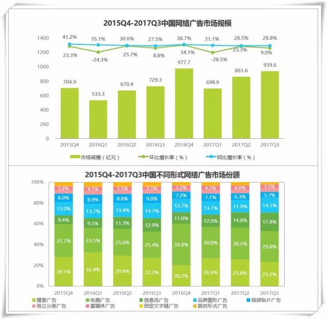 据艾瑞网《2017Q3中国各形式网络广告市场规模》报告显示,2017Q3网络广告市场规模达到939.6亿元,同比增速28.8%,信息流广告占比超过17%。继续保持社交媒体和品牌危机公关高速增长。