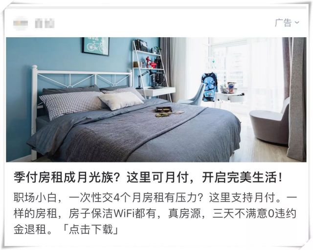 消费者对产品的认可来源于自身对其的需求,而此品牌直观的将自身产品的特性通过问答的形式展现在用户的面前。消费者通过文案以操作证明产品真实性,进一步博得信任。 某租房APP的知乎广告文案: 季付房租成月光族?这里可以月付,开启完美生活!