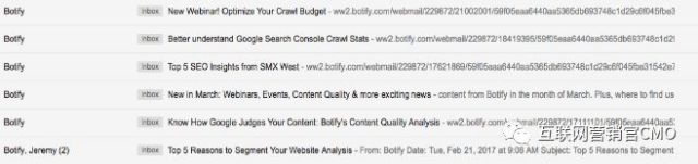 例如您的受众群体的访问者可能到达了: 1.主页 2.个销售页面 3.一个服务页面 4.整个博客部分 5.其他的字面文本 保存你的观众,然后你需要让你的观众建立。一旦至少有300位LinkedIn成员访问该页面或网页,就会开始获取数据,并且会在“网站受众特征”下显示,但在达到该阈值之前,它会说您的受众仍在建设中,您需要等待。这可能需要几天到几周的时间,具体取决于您的网站获得的流量,请相应地进行规划。最终,你会得到你的访问者,数据将填充,你将能够探索和收集一些非常酷的见解。一旦你有这个数据,不知道从哪里开始着手?没关系。这是这篇文章的重点。 使用案例#1:更好的LinkedIn广告定位 让我们来实话实说,LinkedIn开发并发布了网站人口统计数据,因为它预计,有了这些新的信息,企业将更有可能花钱在他们的平台上。毫无疑问,这些信息与LinkedIn广告提供了最好的契合。为什么?那么它所提供的所有信息,比如职位,地点,工作职能,资历水平,公司规模等等,都是可以在LinkedIn上定位的功能。 如果您的登陆页面和/或表单需要填写职位,那么您的CRM很可能最终会包含这样的示例: 1.副总裁 2.财务副总裁 3.财务VP 4.VP 5.VP副总裁 6.副总统 7.执行VP 问题在于,如果您尝试使用数据透视表核对这些数据,那么这些标题中的每一个都将作为一个单独的实体进行计算,这使计算变得困难,特别是如果收集的每个职位中的每一个都有8个或者这样的变体。通过网站受众特征,所有这些数据都可以轻松处理和精简,因为LinkedIn会将职位标题分组到多个组中,以便您通过广告进行定位。没有更多的猜测,如果某些标题可以由LinkedIn来定位。 除此之外,Google Analytics,网站管理员工具,Facebook或Twitter等其他分析来源可能无法提供的商业智能,例如公司规模,公司行业,工作职能,资历水平等。这样,您就可以通过分析哪些用户正在登录哪些网页,并为您提供机会(尽管您必须抓住此机会),将其定位到难以置信的特定受众群体,并为他们提供针对性极强的内容与他们的兴趣有关。 赞助InMail可能是一个很好的工具,因为你可以专门定制你的消息,并能够明智地使用你的信用。提醒一下,赞助InMail邮件是发送到您的收件箱,而不是出现在您的新闻Feed或LinkedIn文本广告的右侧模块中。他们允许您在没有介绍或联系信息的情况下联系LinkedIn上的任何人。InMail邮件在主题行中最多可以包含200个字符,而主体中最多可以包含2000个字符,因此有足够的空间可以传达您的信息。LinkedIn不允许您发送没有主题行的Inmail。 用例2:用于内容创建的商业智能(自然搜索/付费社交) 是的,如果您想要投放LinkedIn广告,网站受众特征可能会非常有帮助,但实际上,除了帮助填充LinkedIn的金库外,网站受众特征还有其他用例。一旦我们掌握了有关访问我们网站的人的宝贵商业情报,我们需要问自己,我们目前是否向这些受众提供他们认为有用的内容?在数字营销行业,我倾向于对任何带有保证的东西持怀疑态度。但是,我几乎可以保证,通过在您的网站上添加更多特别高质量的内容,特别针对你新近发现(或确认)的受众的问题和痛点,您的业务将只会受益。我从来没有遇到一个客户曾经这样说过:“不,谢谢,我们不想再有比我们目前拥有的更高质量的自然流量了。” 例如,考虑访问您网站的人员的资历和工作职能。初级客户经理相比高级合作伙伴可能会对不同的广告文案做出最佳反应。他们有不同的需求吗?正如Tom Critchlow最近写到的那样 ,“太多平庸的内容不是针对某个人写的,并且传播给每个人的。”定制你的内容,尽可能与搜索和阅读的读者相关,而且你会给组织一个更好的机会获得更多的转换(也可能更高的排名,这并不吸引)。 如果您的企业还没有人物角色,那么很可能是创建它们的时候了,比较来自LinkedIn的数据和您CRM数据,了解您最好的(和最差的)客户数据。匹配来自LinkedIn的数据,并从您的实际客户需求访问类似的问题: 他们使用你的公司能获得什么样的价值?他们是否认为你的公司是该领域的行业专家?他们是否转向贵公司进行行业更新?你的公司如何使他们的工作更容易?他们与贵公司合作对超越竞争对手有什么好处?他们希望看到哪些信息目前还不能生成?你公司有什么信息可以使他们的生活变得更轻松?他们从哪些渠道获得行业新闻?他们在什么渠道分享行业新闻? 理想的情况下,你会发现你的细分受众群体的重要性,这些话题也有很大的自然搜索量。这篇文章不是关于关键字研究,但是如果你想阅读一些关于在你的利基市场如何快速有效地进行关键字研究的好帖子,你可以看看: 1.保罗·夏皮罗的Searchlove波士顿2016演示文稿 2.Geoff Kenyon的如何使用rush 3.我在90分钟内如何做关键词研究 但是,并非所有您创建的内容都需要具有良好的搜索量,另一种选择是创建可能与之互动的内容,因为它提供的价值往往是在您的目标受众不知道他们需要的时候。我认为做得很好的几家公司是DeepCrawl,Botify和Onnit,它们会在社交媒体上发送定期的电子邮件和时间精确的文章,我坚持打开查收是因为它们让我的职业生涯(DeepCrawl和Botify)和私人生活(Onnit)变得更轻松。这里关键的一点是,不要仅仅因为你认为你应该或者你的老板所说的创建和发送电子邮件,而是要实际提供有价值的相关内容。当我在收件箱里搜索Botify时的屏幕截图即可: