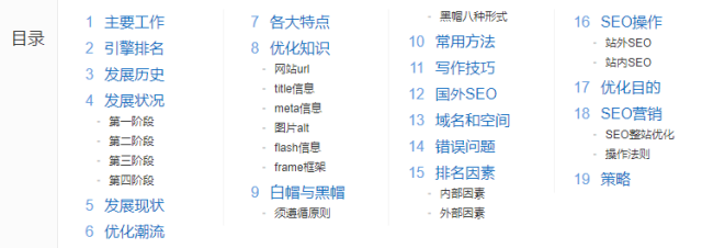 为什么超长文更容易获得搜索排名? 超长文这种网页内容形式,我之前在一些讲内容的文章里面也提到过这点。但是没有展开讲,只是提到过。而且建议大家去观察百科形式的内容,学习百科形式的内容组织方式。 这种超长文的内容形式更容易获得排名也不是最近才这样。这个现象情况起码也有好几年的时间了。所以,这种内容组织形式应该说还是非常受搜索引擎认可的,基本上可以确定为是一种长期SEO内容策略了。但是一直没有被国内的SEO普遍采用,我估计最大的原因还是太懒了,懒的去组织这种内容。 超长文起码要有多少长? 这个也没有一个明确的标准。但我估计可能至少要15个章节点吧。章节点,例如我们以百度百科上的SEO词条为举例。