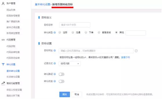 转化目标设置 转化目标需要单独定义,例如注册、下载、留言、加入购物车、生成订单、付款等动作都可以算,访客在网站或app里完成了某项我们期望的动作,就是一次转化。 通过在统计工具后台,设置转化目标(主要分为页面转化和事件转化),我们就可以轻松实现数据的自动统计,主要适用线上平台企业,例如电商、游戏、社交软件等,其行为主要发生在线上。 方法1:页面转化设置 页面转化,是通过对URL的访问进行体现,访客到达特定页面记为1次转化,例如:注册完成页、支付完成页、咨询页等。设置上,在统计工具后台,将特定的URL定义出来即可。