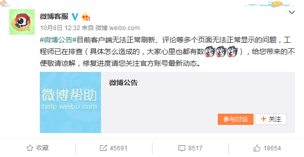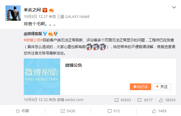 微博客服说,正在排查原因,并打趣道:具体怎么造成的,大家心里也都有数,暗示鹿晗关晓彤公布恋情导致用户操作过量,导致服务器出现故障。微博CEO“来去之间”则做了一个风趣的回复:排查个毛啊。。。