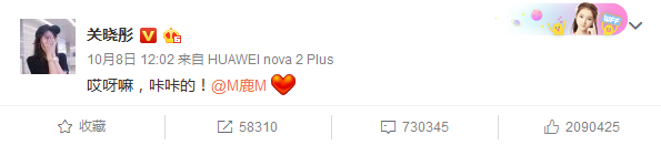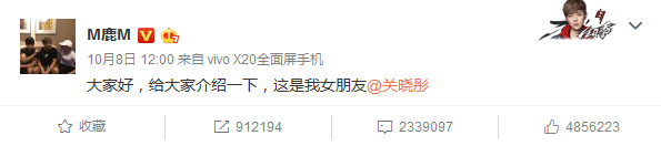 目前,鹿晗公布恋情的单条微博评论数已达230万,女主关晓彤的微博评论数也达73万,二人微博转发数已超过100万。