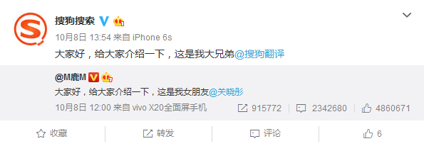 10月8日12:00,当广大媒体人还在堵在上班路上的时候,鹿晗发布了一条微博“大家好,给大家介绍一下,这是我女朋友@关晓彤”,2分钟后故事的女主角关晓彤发布了微博“哎呀嘛,咔咔的!@M鹿M”进行了回应,微博话题瞬间被引爆,微博客户端一度因为该话题出现宕机,微博客服赶紧出来回应: