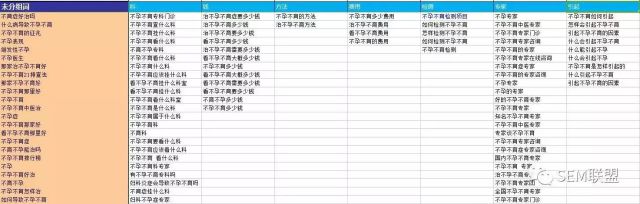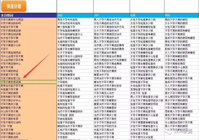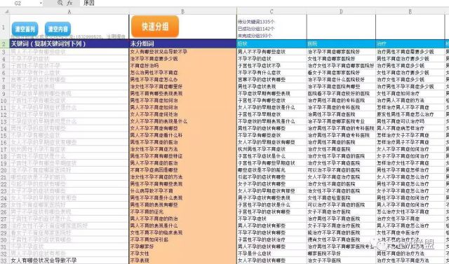 3、假如我们已经拓出一批关于不孕不育的词,并且已经把重复的无用的关键词删除,下面就该给它们排排队分分组。将搜索好的关键词粘贴到快速分组工具,如下图所示按照大的需求和类别进行第一次粗略分组,比如症状类的,医院类的或者男性,女性等等。