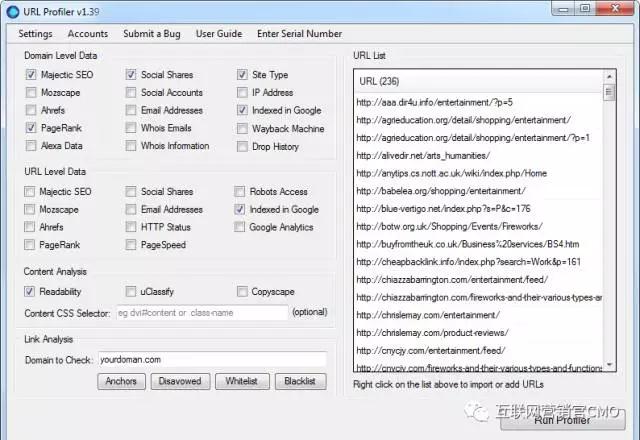 检查链接指标 有了网址列表后,建议下载URL分析器。这个工具会大大减少分析数据的时间。将URL导入URL Profiler,并连接Google Analytics(分析)和Ahrefs,Majestic或Moz(链接指标)并运行分析器。 建议:如果没有足够时间,请务必选择至少90天。
