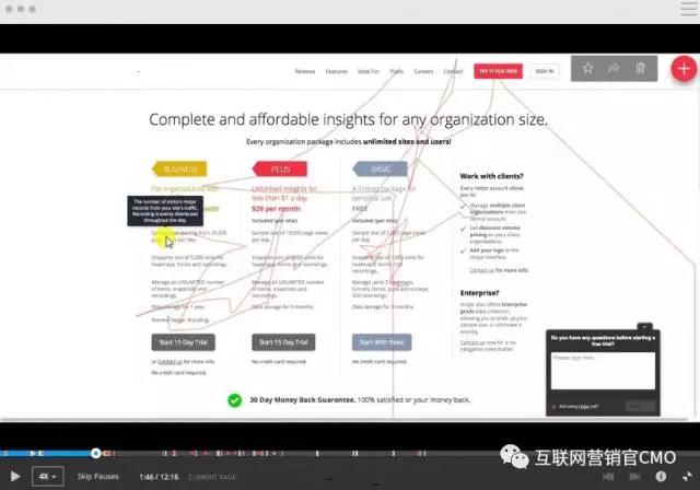 问正确的问题 调查中问正确的问题,否则数据就没用了。下面是一些例子: l 访问网站的时候第一印象是什么样? l 您差点没买的因素是什么? l 网页上有没有缺失的可以帮你决定购买的东西 l 通过对比后您为什么选择了我们? l 您为什么离开网站呢? 观看人们如何浏览您的网站 为了真正了解访问者与网站的互动,还应该整合访客记录(Hotjar能帮助您)。这将允许重新查看网站上是否存在任何可用性问题。获得反馈非常好,但是用户浏览网站时也可以看到会话重播。