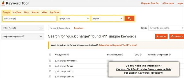 首先找到我们想要做的目标关键词,我举个例子:quick charge, 当我们打开Mozbar工具后,查看google SERP页面会发现,基本上排名在前十的都是DA70+,要想打败这些站点可以说是比登天还难,除了外链策略要做得好,其次还要网站运营时长,做这类的大词显然是不明智的。我们知道大词非常难做,而且商业价值也比较低,所以我们把上海胜加广告思路换一换,通过扩展该词的长尾去找机会鸿沟。 使用keywordtool.io去找到扩展长尾词。 OK,当我们把关键词输入进去后,会出现一系列的seo建站长尾关键词,如图所示。