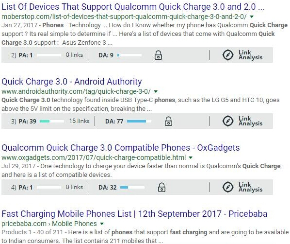 然后我们一对一的把关键词放进google里进行搜索,查看排名前十的DA情况。我搜了将近50多个关键词,发现平均DA都是在70+以上的,所以我们直接放弃quick charger这个词的拓展,我找到了quick charger 3.0作为目标关键词,按照刚才的办法继续拓展长尾关键词。OK,然后我们找到了一个词 “quick charge 3.0 phones”,搜索量在100-1000区间的,出价还¥7.66。总体还行!