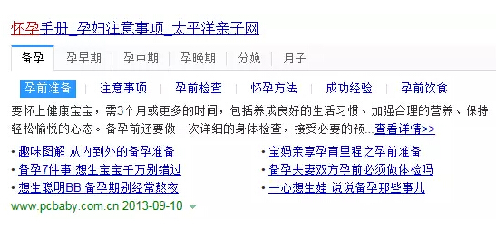 百度说:它有60亿个关键词词库,能够非常快速的识别出页面内容主题,内容质量等方面。所以,现在做内容,想要依靠程序打乱重组,大量做可读性差的内容是行不通了。可是书籍的软文推广软文,笔者发现目前还这样操作内容的,是市场上那些做站群卖文字链的,它们设置关键词依靠程序大量抓取内容,然后打乱重组后在发布,并在文中插入锚链接。除此之外,在没有发现其他正规网站是这样做的。 百度目前提倡的内容:一是高质量整合质量,即伪原创,二是纯原创内容,三是翻译内容,也认为是原创内容。依靠大量采集,一模一样发布出来的,在百度里别说获取排名,收录都很困难。除非它是百度认可的行业标杆、高信誉、高权重网站。 当下,热门关键词在百度里排名较好的,内容性质大多属于专题聚合,还有一种是非常具有深度、广度的内容,它从各个角度去阐述这个命题,如知乎。像知乎这种形态的内容,将来是比较迎合人工智能算法的。百度说:将来人工智能如完全应用到搜索算法上,它就是一个非标准的排序方式,这个页面能不能够获取排名不是由现在固定的因素决定,它会汇聚各种相关或不相关的因素,都会影响到这个页面在搜索上的排序。 前面,我们提到的什么高质量伪原创内容,还是原创内容,想要获取搜索排序,它们除了内容本身外,还需要其他大量的资源去促进支持该页面排名,比如等收录,加内链、外链等。还有种内容表现方式,百度一直倡导,但是极少有网站平台去做。这种内容形态能够在相对较短时间内获取百度搜索排名。那就是做一个具有主题完整性的内容,按照事情的发生步骤,从开始到结束,罗列排序井井有条。 我们发现,目前各大网站做的专题聚合,它只是把主题相关内容全部罗列出来而已,它并没有对内容发生先后顺序进行排列,这使得用户在看内容时,是在一个思路引导比较乱的情况下进行的。 以“怀孕”为例,百度工程师对“怀孕&rdquo安全用电宣传海报;这个事件主题的顺序关系,进行了较完整的罗列展示,使用户在浏览时能够清晰的明白整个过程: 其实,这些内容相信无论在哪家育儿平台上都是有的,只是他们没有这样去做,基本上是随便设个关键词,然后把内容符合这个关键词的,全部拉过来,聚合成一个页面。这样的内容形态,我们发现只要你在百度里不是一个权重很高的网站,基本上也很难获取排名。