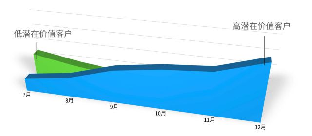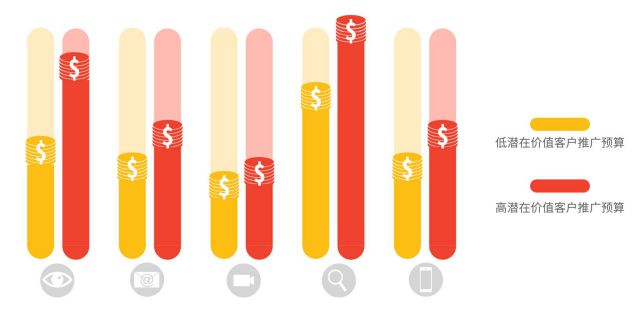 按用户潜在价值分配预算 通过上面简单的客户潜在价值分析,商家在制定推广计划的时候就拥有更多的参考数据,而不再是仅仅局限于客户的年龄、位置、性别等基本信息。因为客户的潜在价值有高低之差,这意味着我们需要采取不同的推广方式,有所侧重却又更明智地制定策略和预算。