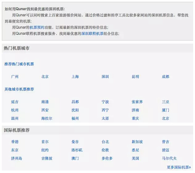 只是截了一小部分,页面上实际有近20个不同公司、时间的航班信息,文字内容量并不少,而且相关性高。 通常旅游网站的机票页面是特意生成的静态页面,每一对城市都生成对应页面,有时还不止一个页面。这些页面并不是用户从首页进去查看机票时看到的页面,但这些页面在网站上都有爬行、抓取入口,如下面去哪儿截图: