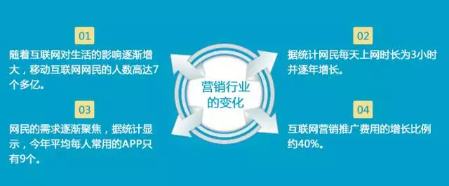 从市场的大环境来看,在经济只有6%的增长的背景下,的广告费增长约40%,却未降反增。用户关注度逐渐从传统广告、PC网络转向移动端。 1、改变营销推广理念、方向,怎么找平台推广吗利用大量的信息流的流量入口去做相关的营销推广。 2、营销的本质要回归到品牌。