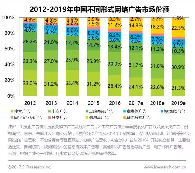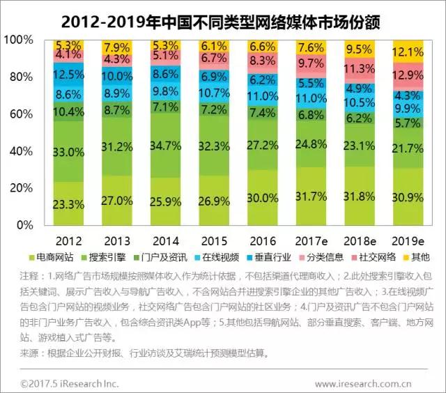 网络媒体:电商类广告全面逆袭,社交类广告份额持续上升 网络媒体中,搜索引擎不再是占据网络广告份额的媒体形式,占比下降5个百分点至27.2%,位列第二。电商网站广告成功逆袭,超越搜索引擎成为广告份额媒体形式,未来几年中还将持续稳定在30%左右的份额。此外,社交广告占比为8.3%,较2016年增长较快,伴随着社交领域与场景的不断结合、广告位资源和信息流广告形式的不断优化,份额还将持续上升。 在方面,受新广告法影响,搜索类广告收入增速有所放缓,同时,随着用户对电商的依赖和使用行为的转移,移动端电商类广告收入持续保持较高速度增长,在整体移动广告市场中居首位,占比达27.3%,预计2017年将达30%。而社交类、视频类分别作为用户使用频率最高、用户使用时间最长的服务,通过原生广告、信息流广告等新兴广告形式,降低了广告对于用户体验的影响,并进一步开发了用户价值,未来仍会有较大的增长空间。此外,伴随着移动广告市场马太效应的增加,中长尾平台及流量对广告主的吸引降低,包括中长尾流量在内的垂直行业未来增长相对乏力。