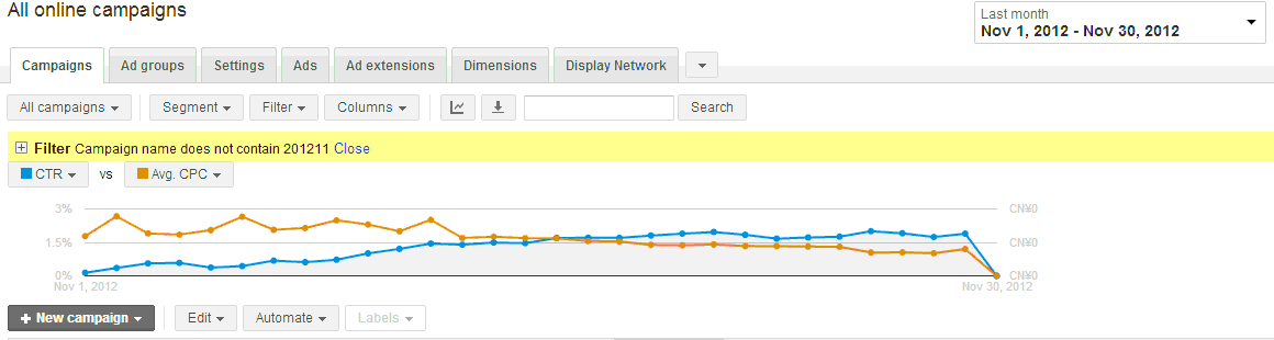 那么,如果做到这么一个完美的数据曲线呢?我们需要明确的一点是,虽然我们的主要KPI是cpc和ctr,但是我们不能一味地为品牌客户服务,谷歌内容广告优化最主要的考量标准就是cpc和ctr了。一个专业的SEM,最终优化得出来的数据图表应该是如下图所示,前期cpc较高,ctr较低,随着你的优化,先逐步达到一个高峰,然后逐步平稳并稳中有升。