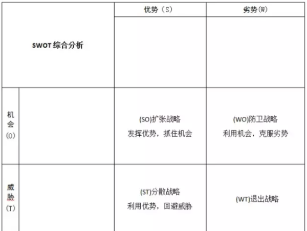 1.SO战略(优势机会)。即扩张战略,适市场营销方案合内部优势明显、与外部机会一致的企业。在这种情况下,企业可以利用外部机会,充分发挥自身优势,充分利用机会和优势。但是机会往往转瞬即逝,所以企业必须敏锐的抓住机会,抓住机遇,寻求更大的发展。