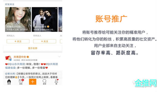 粉丝通由新浪公司推出的官方产品,能基于所有新浪微博用户精准定位投放广告信息!它可以让企业微博广告投放展示在微博客户端的信息流中,使您的广告展现给指定的目标人群。微博粉丝通推广优势凸显头条信息内容您的 由新浪公司推出的官方产品,能基于所有新浪用户精准定位投放信息!它可以让企业微博广告投放展示在微博客户端的信息流中,使您的广告给指定的目标人群。微博粉丝通推广优势凸显信息您的粉丝或非粉在24小时内首次刷新微博,将出现微博首页信息流的前三条。