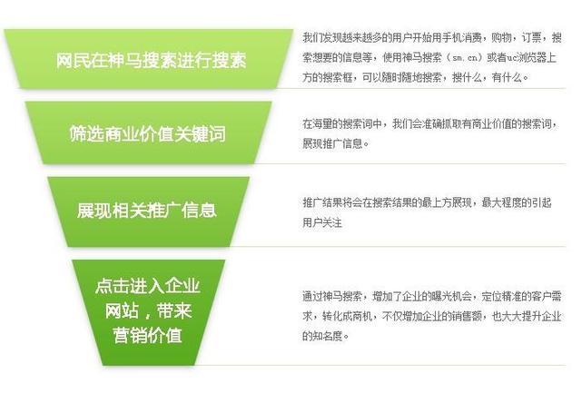 神马推广是阿里巴巴联手UC浏览器开发的、基于神马搜索的一种按效果付费的移动网络推广方式。每天网民都会在神马搜索里进行大量搜索,其中一部分搜索词明确的表达了相关的商业信息。神马推广通过对搜索词的严密技 推广是阿里巴巴联手UC浏览器开发的、营销型网网站基于的一种按效果付费的移动网络推广方式。每天网民都会在神马搜索里进行大量搜索,其中一部分搜索词明确的表达了相关的商业信息。神马推广通过对搜索词的严密技术分析,在网民搜索词下出高相关度的推广结果。神马推广已实现精准定向、严格控制每日预算,让您能根据自身的需求定制推广在哪网站建设。