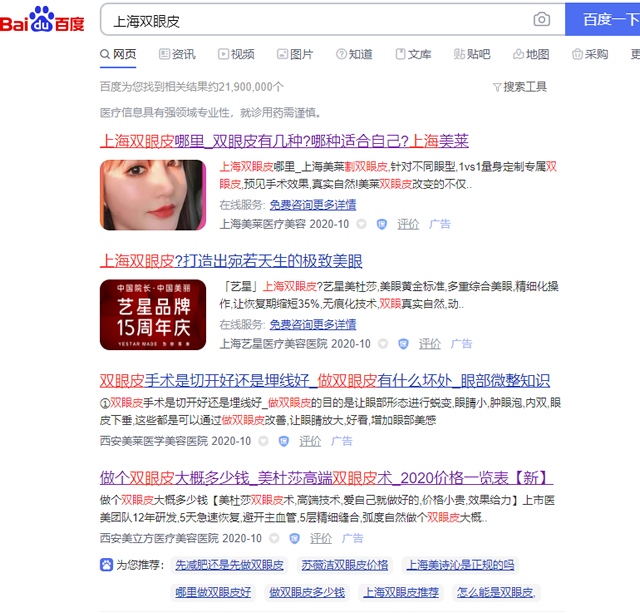 以上海地区电脑端搜索为例(其他地区基本情况一直):项目词搜索,竞价排名占据4个主要位置,其次为其他平台相关信息,很难看到优化