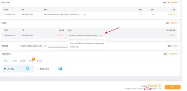 4).支付购买产品,选择最大面额代金券红包,获得一定支付金额减免,成为阿里云专属会员。