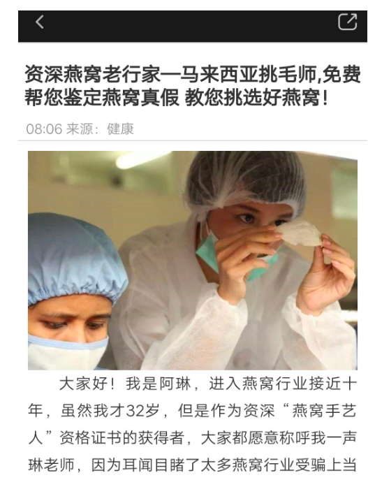 点击进入落地页,落地页是一篇长文,里为用户分享如何辨别燕窝真假,挑选好燕窝,文字描述还有图片展示对比好的燕窝和坏的燕窝的区别对比,用户可以一目了然,落地页的下方还有用户的评价,看了评价的用户不难发现评论里面都是说广告主家的商品是好的等等,让用户也更加。