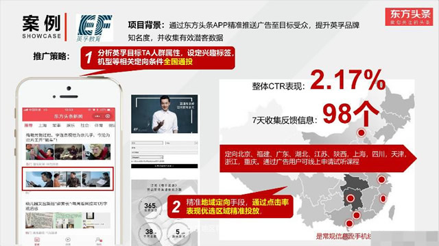 精准的竞价广告比较适合对广告转化效果有很高要求的用户。能够精准的向消费者展示广告,展示产品,给目标受众刺激购买行为。东方头条推广在竞价广告环节当中,简单的说就是价高者得这样的一个广告展示机会。其价格在不同城市的不同展示方式也有可能不同,这还要具体看我们定向投放的城市以及地域。