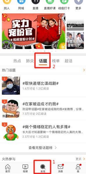 打开微博,找到发现里面的话题。因为发布的这个微博是需要有曝光量的,所以我们应该发一些比较热门的话题,这样才会有更多的人关注。才会有更多人的看到发的微博,然后加我们的微信。