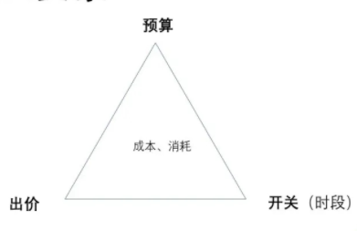 咱们往下说,比方说当你把这些东西都现已设置好了,假定创意和定向设置好了之后是不变的,就让它自己去跑,那在这个过程中咱们能操控的最首要的东西,便是这三个:预算、出价和开关。