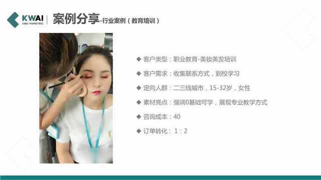 美容、招商加盟、直营电商、淘宝电商、二类电商、教育培训、展会、美发、婚纱摄影、汽车机车、家居、机械设备、餐饮/服装门店等行业属于热门的优质行业,投放转化效果比较好,也有相对比较多的投放以及转化数据做参考。以前行业的公司目前来投放快手广告,相对来说比较有优势。