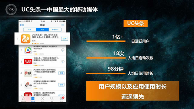 因此,如何挖掘聚集大量手机用户平台的潜在营销价值、使广告效果达到最优,成为每一个广告主专攻的课题。UC头条广告平台正是在这样的背景下应运而生,将为每一个广告主解决如何让信息更精准地流向目标用户的问题,从而提升投放回报率。 首先,UC头条广告平台的优势在于依托海量的数据,其信息流日量可高达40亿。