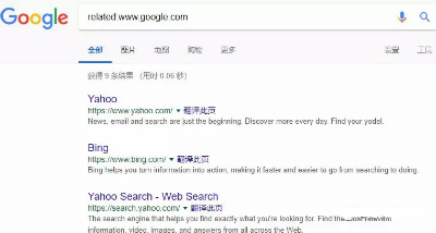 这个语法是用于搜索语某些页面相关的网站的,可以辅助我们搜索同类的页面。比如我们输入“related:www.google.com”,显示的结果都是一些其他的搜索引擎。